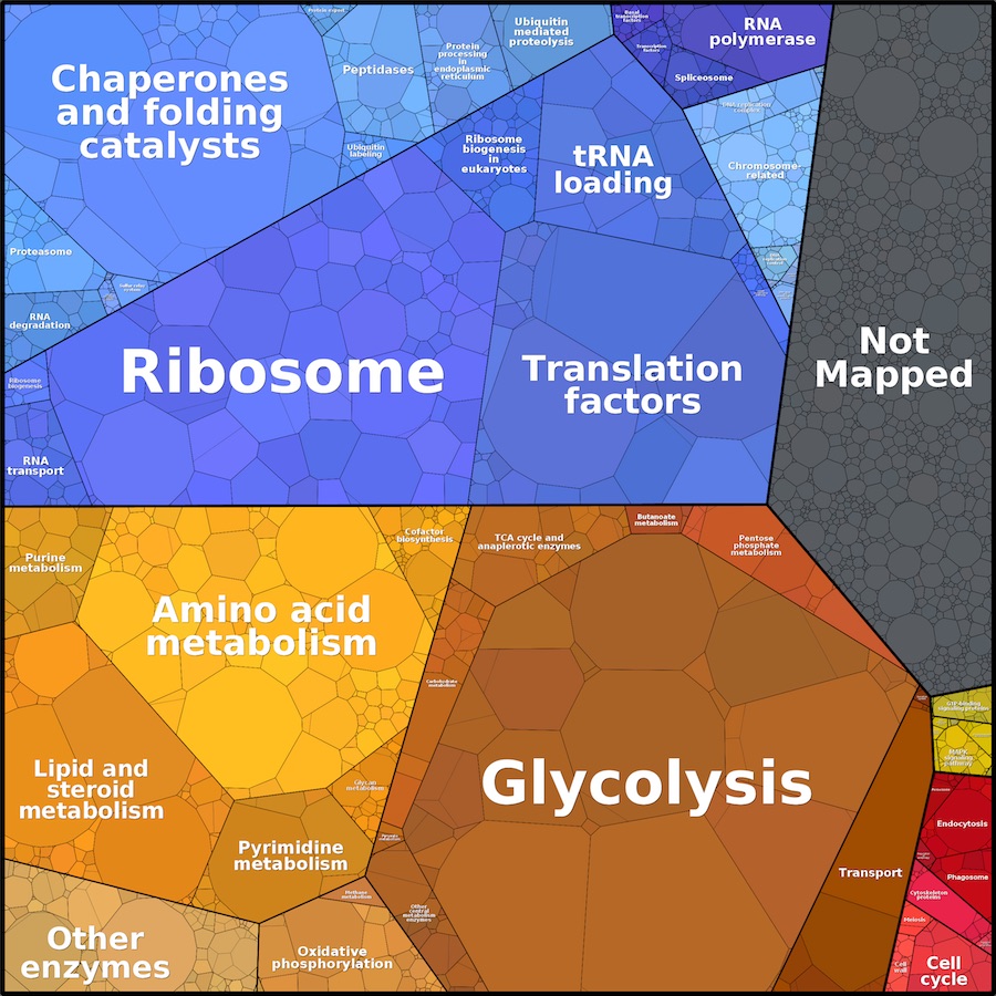 Proteomapsというサイトからの図で出芽酵母の細胞内タンパク質の割合が面積比で示されている。何千というタンパク質がある中でリボソームがいかに豊富に存在するのか一目瞭然だ。