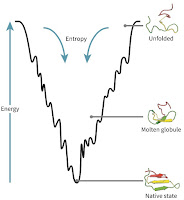 蛋白質の立体構造形成、すなわちフォールディング(折りたたみ)の基本は、アミノ酸配列さえ決まれば蛋白質の立体構造は一義に決まる、というものである(Anfinsenのドグマと呼ばれる)。別の言い方をすると、蛋白質フォールディング反応は自発的、熱力学的に言えば、ギブズの自由エネルギー(ΔG)が負ということである。これを概念的に図示する場合、よく使われるのが右に示すようなフォールディングのエネルギー地形で、フォールディングをファネル(漏斗)に例える。この「漏斗」の上方はさまざまな変性状態が集まっていてエントロピーが大きい状態で、下へ落ちるにしたがって少しずつΔGが小さくなっていく(図の上ほどエネルギー大)。最終的にΔGが最小になったところ(漏斗の一番下のとんがった部分)でフォールディングは完了して天然構造となる。