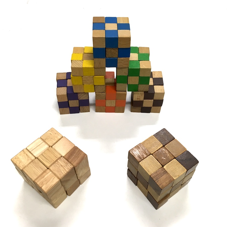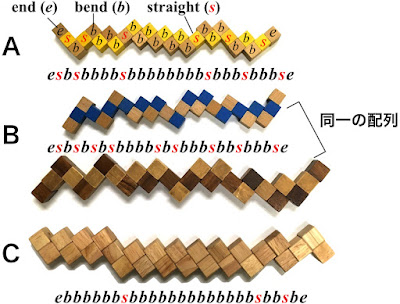 この中には(3×3×3のキューブ型にはなるものの)複数の折りたたみ構造をもつ配列も多数あるが、7,268種の配列はその折りたたみ構造が特異的(ユニーク)であった。写真の3種類はいずれもユニークな配列だった。(私の感想としては、このキューブパズルで商品化されている「構造」はごくごくわずかであると言えよう)。