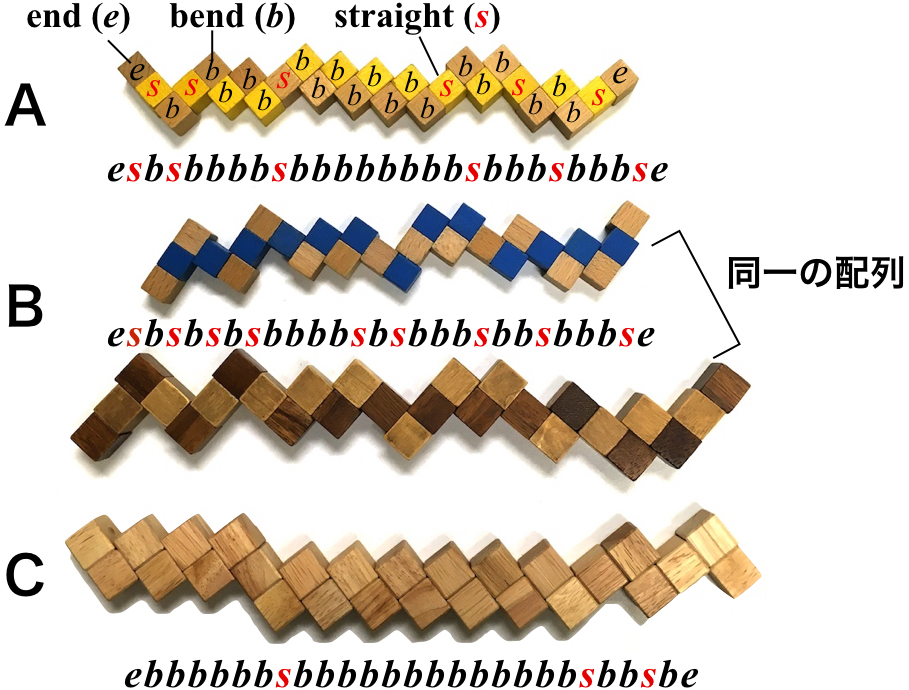 注1:経路が別々のものや4×4×4の超難解なものをそこそこもっているだけではない。ラボには青色パズル(B)と同じ経路のものが教材として160個程度ある。東工大1年生向けに蛋白質フォールディング入門のような講義を担当しており、その際に生命理工学院1年生全員(150名程度)に一人一個ずつ配布してパズルで遊んでもらって蛋白質フォールディングの難しさを実感してもらっているのだ。10~15分ほどフォールディングにトライしてもらう(遊んでもらう)。「シャペロン」となってフォールディングを完成させる学生は1割に満たない。