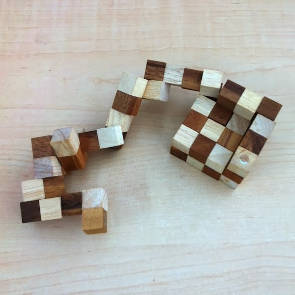これまでの3×3×3パズルでは、片側から順にかたちを作っていけば完成するのだが、今回付いてきた解き方はちがう。最初は片側からかたちを作っていって塊を作ったあと、反対側からかたちをつくってもう一つ塊を作る。すると、下の写真のように二つの塊ができるので、この二つを合わせることで立方体となり完成だ。